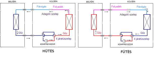 Ha a klímát hűtési funkcióra állítjuk akkor bent hűt, kint pedig fűt. Télen ez a folyamat megfordul és a klímánk bent fog fűteni, kint pedig hűteni. A hűtőközeg, amely kint párolog el, mindig alacsonyabb hőmérsékleten teszi azt, mint a környezeti hő, ezért tudja annak energiáját felvenni. Ezt a felvett hőmennyiséget a klíma készülékbe épített kompresszor nagyobb nyomásra emeli fel, ezáltal nagyobb energiaszintre is. Ezt a hőmennyiséget szivattyúzza be a klímaberendezés a beltéri egységbe, amit a beltéri egység befúj a lakás/ház belterébe, felfűtve azt.